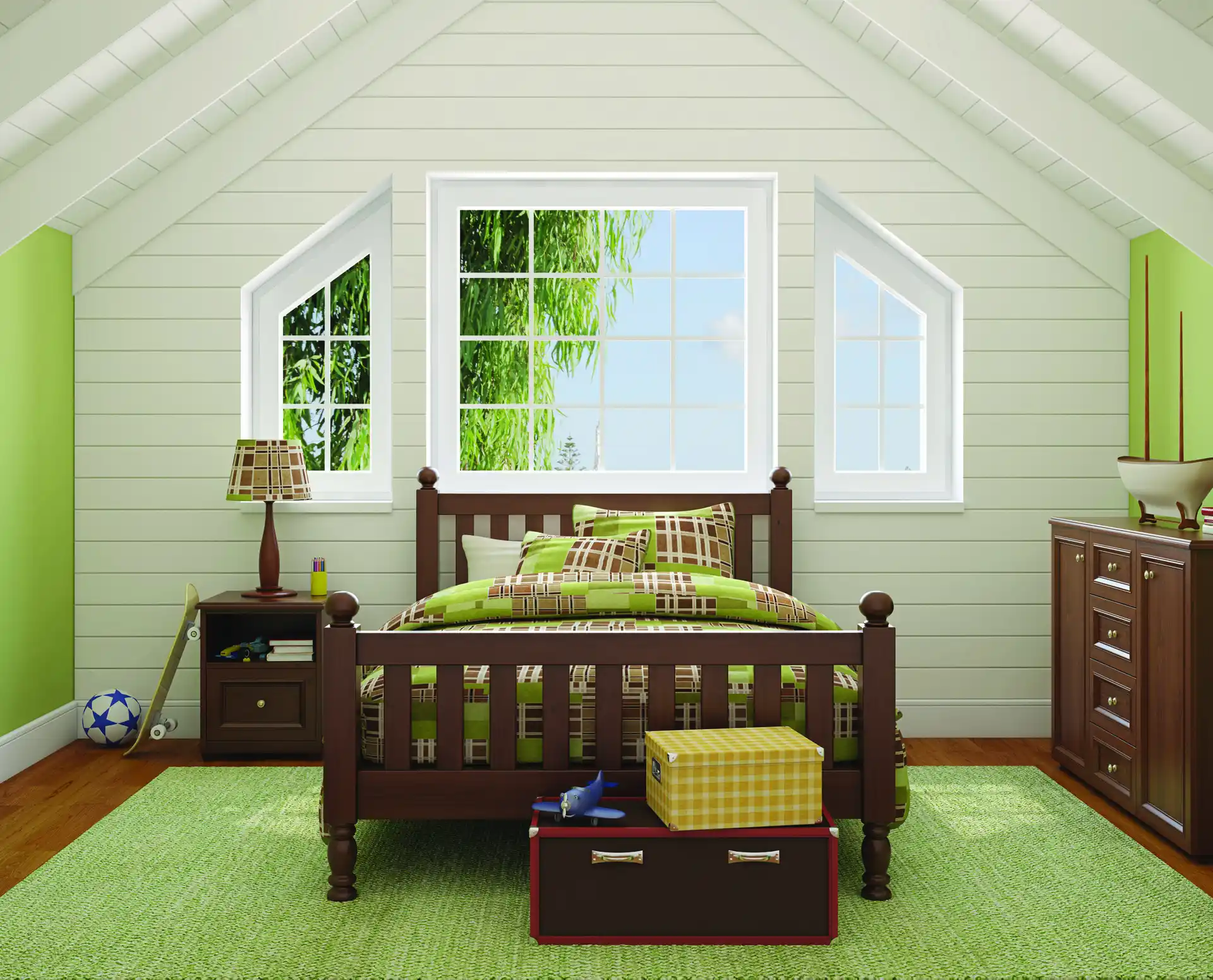 - Fixed-glass, geometric-shaped windows enhance architectural appeal